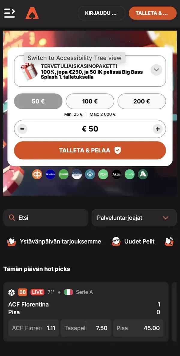 Pelaamisen puolella voit hypätä Casinoist-kolikkopeleihin, live-rulettiin, blackjackiin tai nopeisiin peleihin, kuten raaputusarpoihin ja kenoon. Monille suomalaisille pelaajille avainasia on nopea EUR-maksuliikenne ja selkeät rajat. Tuemme Visaa, Mastercardia, Skrilliä, Netelleriä, kryptoa ja paljon muuta, ja mobiiliystävälliset prosessit toimivat talletuksesta kotiutukseen.